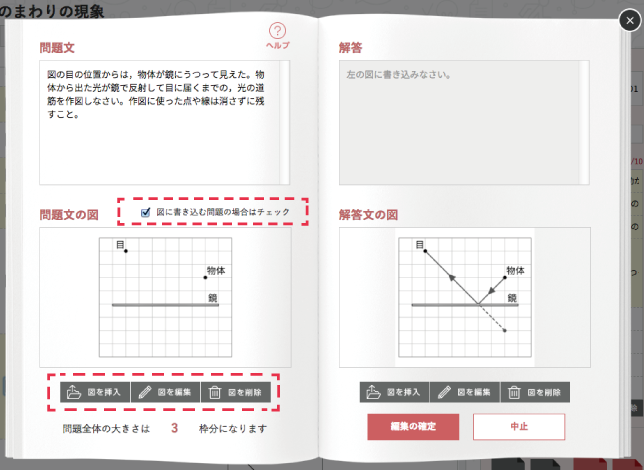 問題にお手持ちの図を挿入したいときは「図を挿入」を, 挿入してある図を消したいときは「図を削除」を選んでください。 また,作図問題をつくりたいときは,「画像に答えを書き込む問題にする」のにチェックを入れてください。 すると,新たに右側に解答画像の枠が表示されるので,そちらに解答用の図を挿入してください。 |