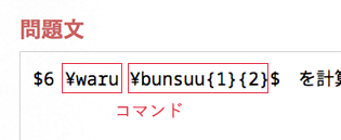 問題編集画面では,数式や記号がコマンド入力された状態の テキストが表示されます。 このテキストを編集することで,お望みの数式を出力できます。 |